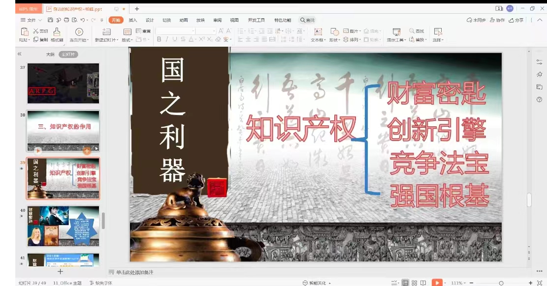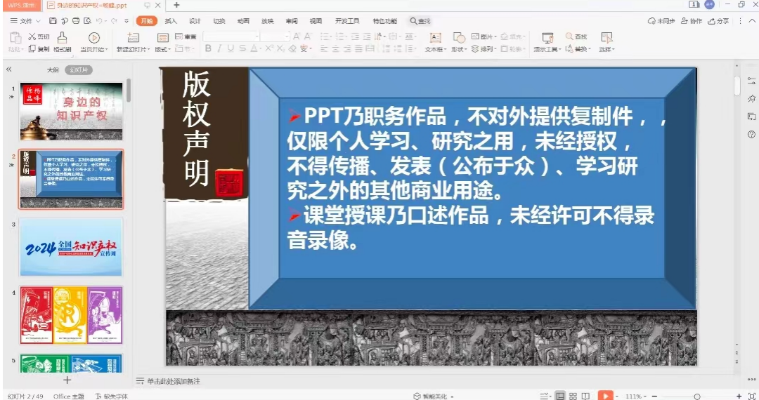 本次讲座主题是“身边的知识产权”。杨峰老师以知识产权是什么、有哪些内容、有什么作用为主线,首先从日常ppt和老师授课口述作品引出知识产权的定义,强调知识产品的属性与公共物品的属性极为相似,都具有非竞争性与非排他性,这就导致知识产品也面临一种公地悲剧的命运。杨峰老师教育同学们要尊重知识成果,时时警醒自己。接着详细分析知识产权,讲述权利人依法享有哪些知识产权,比如著作权、商标权、专利权。最后表明知识产权是财富的密钥,创新的引擎,竞争的法宝,强国的根基,我们要增强维权意识,维护自己的权益,也要尊重他人的辛苦成果。