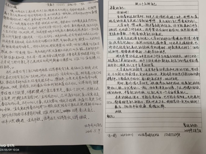 见字如面,展信如唔。致“四年后的自己”通过信件的方式给予同学们畅想梦想、许下期待的平台。本次活动以学生对大学四年的规划、定位和期许为主旋律,通过文字与未来建立联系,督促同学们不忘初心、砥砺前行,希望同学们认真评估自身情况,明晰目标规划,用实际行动书写未来崭新的蓝图,并为同学们提供一个倾诉自我内心深处的空间,在书写过程中与自我对话,保持积极乐观向上的健康心态。信件简短,一字一句都是真挚的投入;信件冗长,千言万语皆是青春的风采。铭记此刻,勾勒未来,以青衿之志,一本初衷,履践致远。