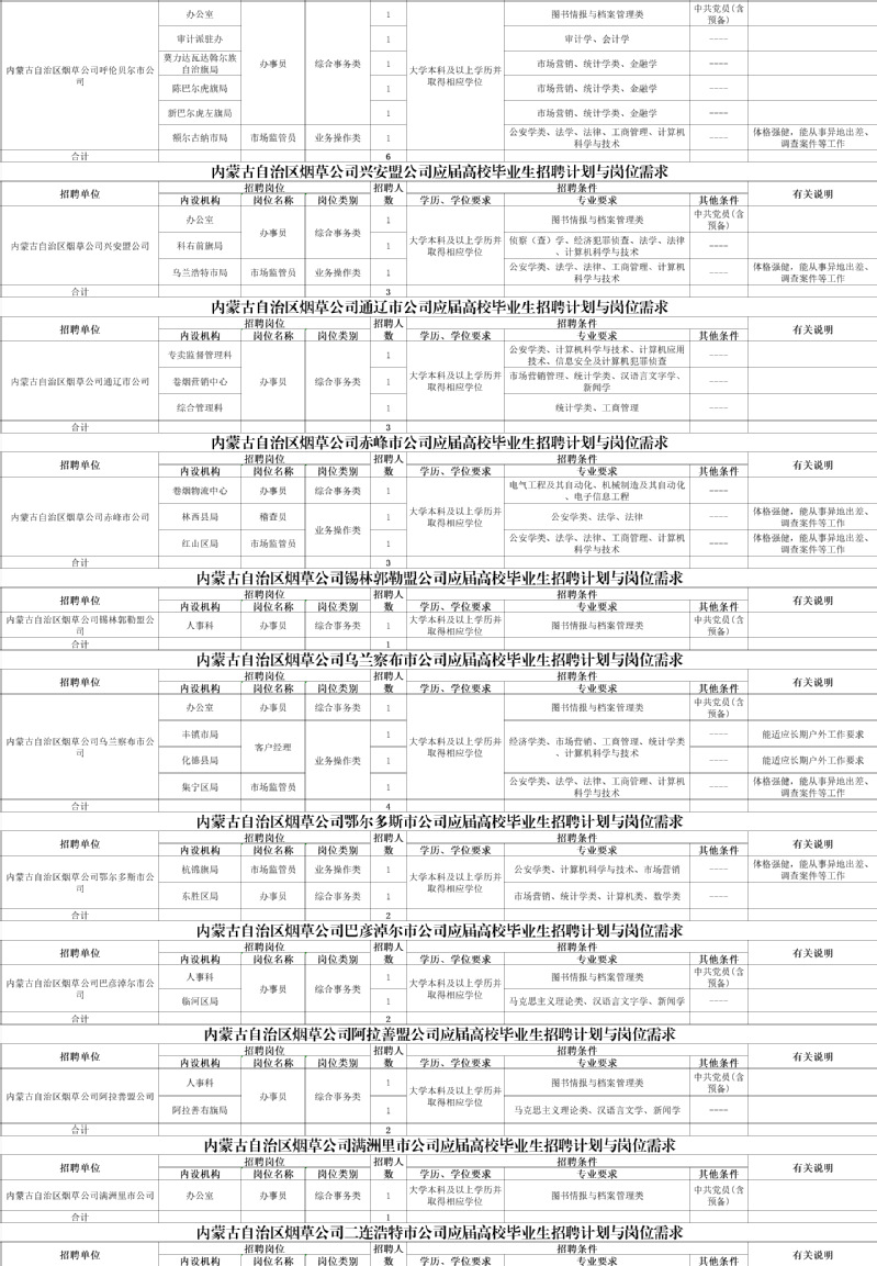 附件1:中国烟草总公司内蒙古自治区公司2024年第二批次应届高校毕业生招聘计划与岗位需求
