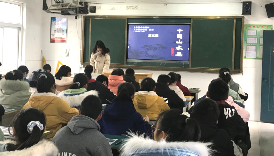 早上8点20分,一行人乘车抵达槐林初中,在槐林初中副校长褚柏清的带领下,看望了实习生,并察看了实习生的食宿、课程安排、实习指导教师的配备等情况。随后检查组老师在教学楼三楼听了美术学专业实习生张祎萍的美术课教学——《中国山水画》。课后,褚春元和余荣琦召开了听课反馈及实习工作座谈会,美术学、英语、数学、体育四个专业12名同学到会。座谈会上,槐林初级中学的校领导、教务处负责人介绍了实习生的相关工作情况,肯定了实习生取得的可喜进步,对我校实习生实习工作给予高度认可。褚春元和余荣琦衷心感谢槐林初中对我校实习工作的支持。随后,褚春元谈了自己听课后的感受,肯定了主要成绩,并指出了存在的问题和不足,勉励实习生认真实习,强化师范技能,巩固专业知识,争做一名优秀的人民教师。美术学教研室主任李超峰和专业指导教师就听课情况给实习生提出需要改进的地方。实习生们畅所欲言,谈及进入实习学校以来的成长和收获,感受颇丰。