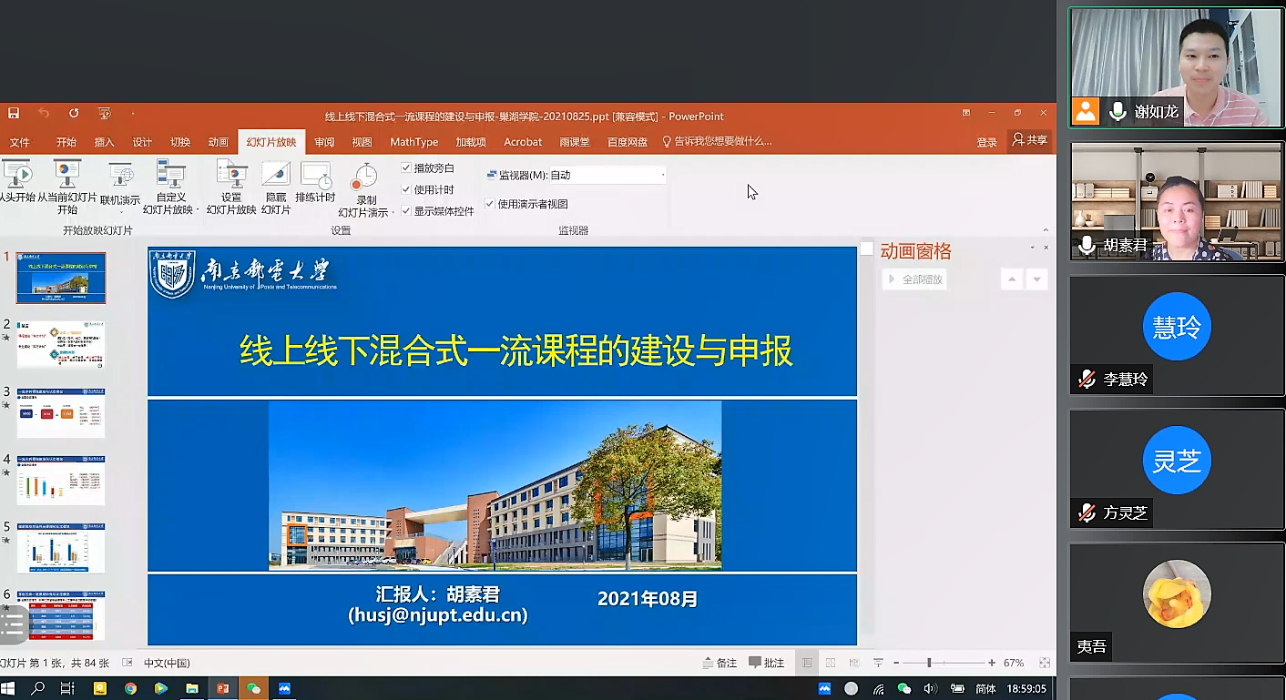为进一步推动我校一流本科课程申报及建设工作,8月25日,教务处特邀国家级一流课程负责人南京邮电大学胡素君教授通过腾讯会议在线为我校教师作“线上线下混合式一流课程的建设与申报”专题培训,各二级学院副院长、申报一流本科课程项目负责人及其课程团队和其他感兴趣的教师在线参会,会议由教务处副处长谢如龙主持。