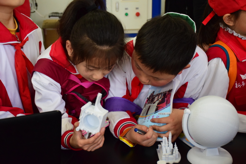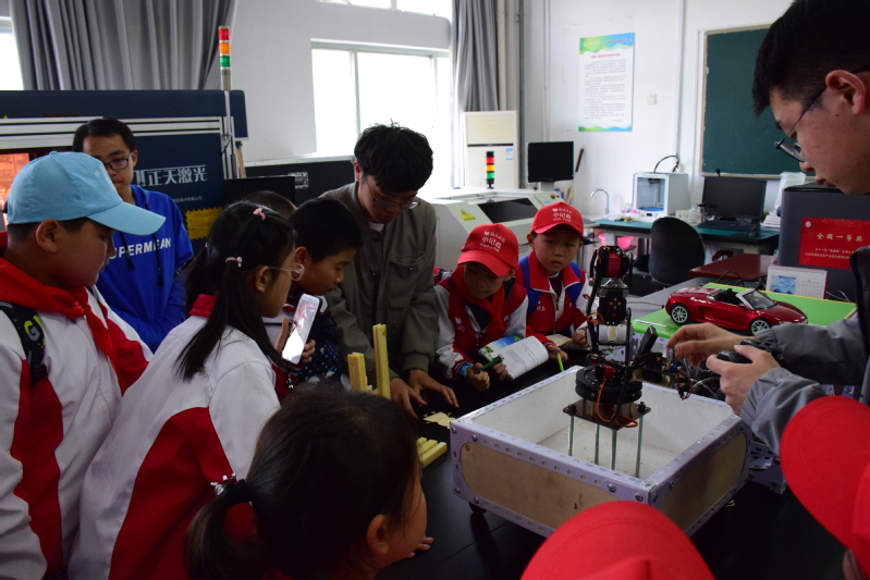 接着,小记者们排队来到机械工程学院和电子工程学院实验室。在激光加工制造实训实验室,小记者们看着3D打印机,望着自动摘过机,看着激光切割出来的小猪佩奇,小记者们好奇心不断。