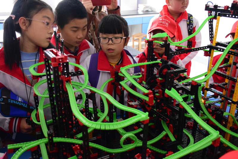 在机电创新实验室,拼装龙门吊车、拼装游乐场摇架、拼装升降台、多功能云霄飞车等装置开拓了小记者们的视野。