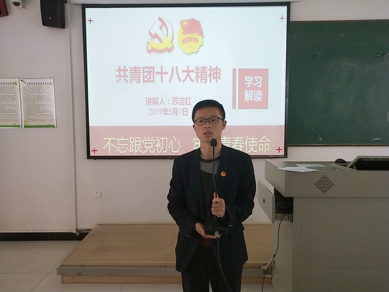 仪式结束后,苏洁红做了题为《共青团十八大精神解读》的团课,苏洁红从共青团十八大大会概况、中央致辞、报告解读、团章修改和习近平同团中央新一届领导班子集体谈话进行解读。他指出,中国共青团的初心就是坚定不移跟党走,中国共青团的使命是为党和人民不懈奋斗。广大团员青年要始终坚定理想信念,着力锤炼高尚品格,勇于投身创新创造,不断增长能力才干,永远保持奋斗精神。苏洁红强调,团员青年要认真学习共青团十八大精神,要积极做好党的助手和后备军。要用习近平新时代中国特色社会主义思想构筑强大精神支柱,要不断学习,提高综合素质,要有担当,勇于革新,甘于奉献。