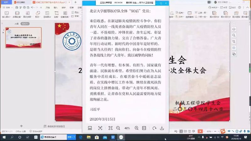 2020年4月18日,机械工程学院学生会于线上召开2019—2020学年第二学期第一次全体大会。机械工程学院学生会全体成员参会,学生会主席汪敏捷主持。
