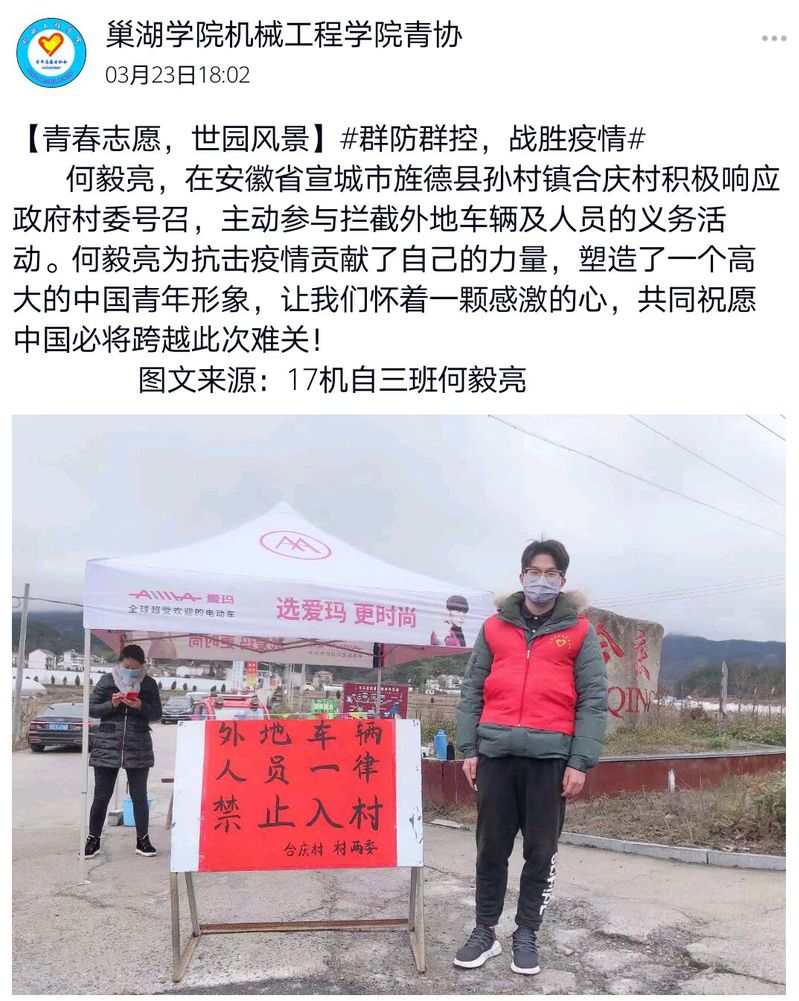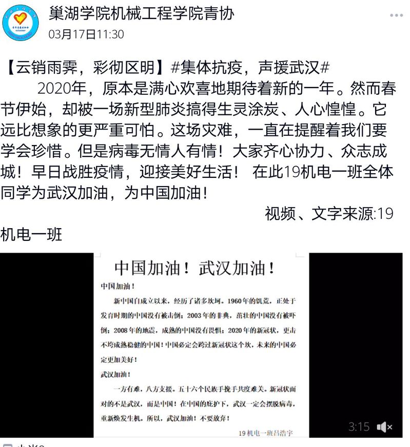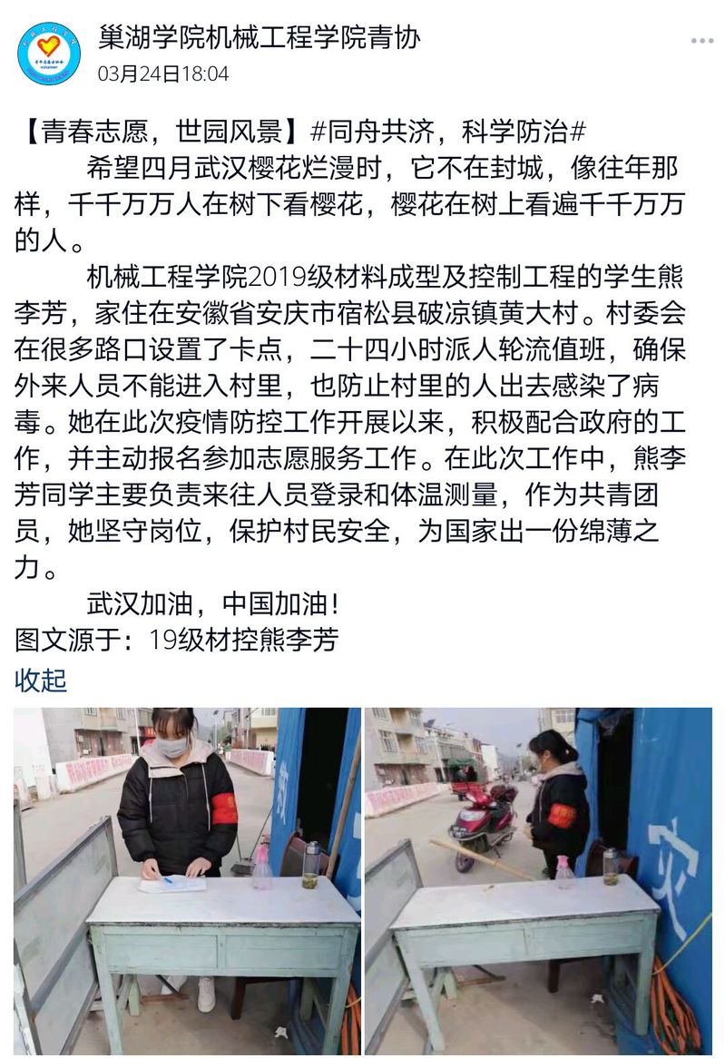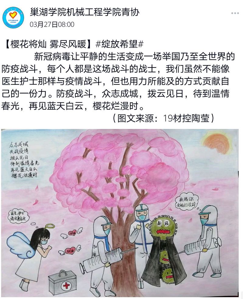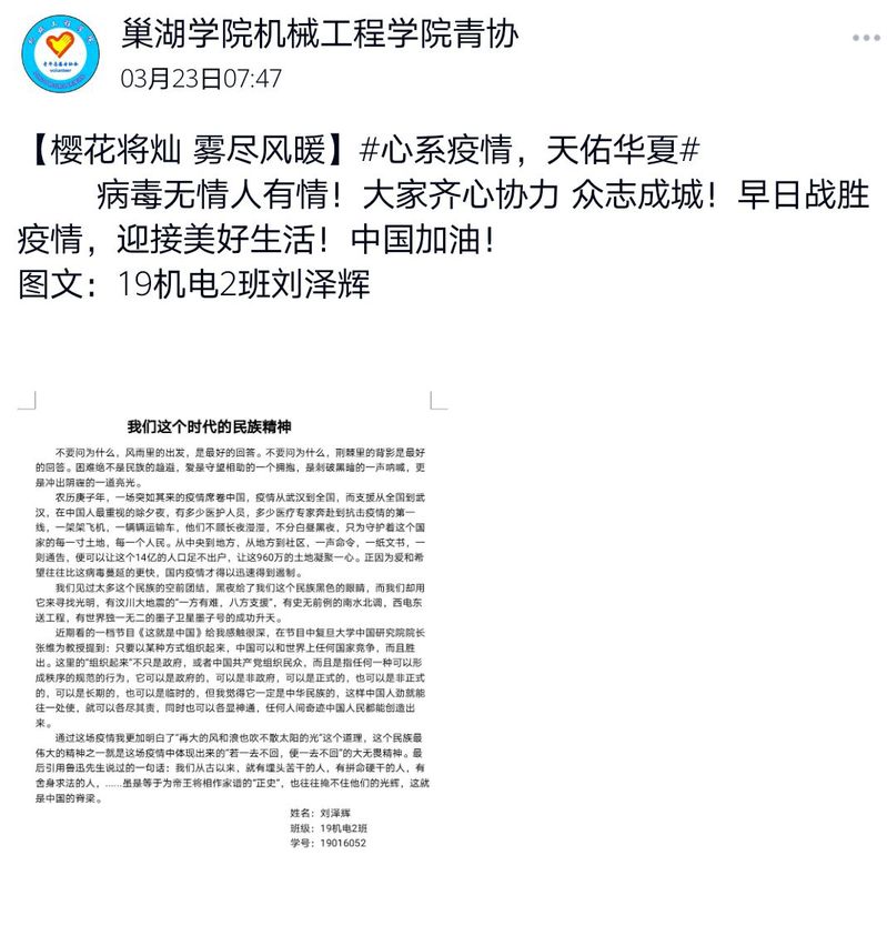 3月3日,机械青协接到金年汇官方入口青年志愿者联合会通知后,便在学院征集关于抗疫的作品、先进事迹等。机械青协副会长傅德曹通过QQ等方式通知了学院各班级负责人,由各班级负责人向各班同学宣传、落实本月志愿者服务工作。3月13日,机械青协召开本学期第一次线上会议,讨论关于此次作品收集、整理与宣传具体细节。3月16日至3月28日,机械青协官Q对本次活动所收集到的作品进行网络宣传,3月30日,机械青协再次召开线上会议,对志愿服务月进行工作总结,积累经验,为下一次活动的成功举办打好基础。