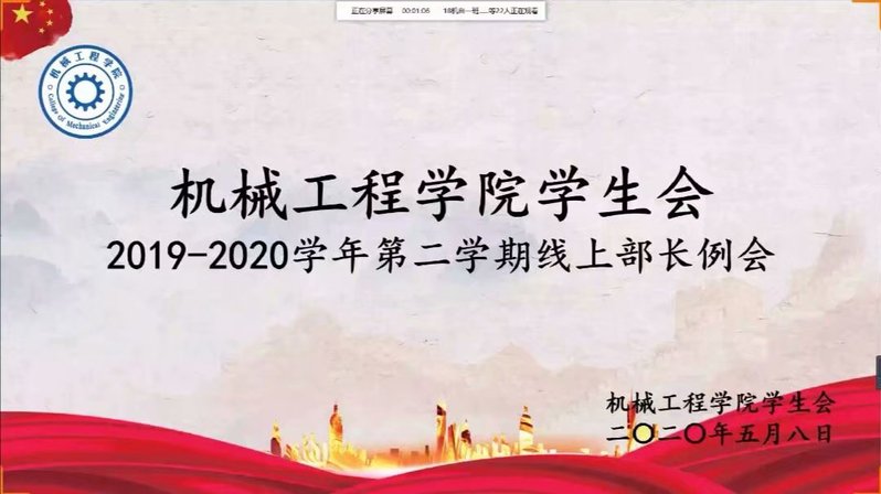 为更好地开展学生会各项工作,机械工程学院学生会于2020年5月8日中午在线上召开本学期第一次部长级例会。会议由院团总支书记苏洁红主持,学生会各部长参会。