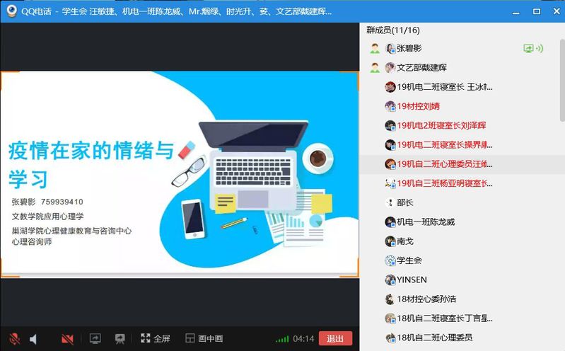 5月23日上午,张碧影利用QQ分享功能与我院学生连线,开展以5·25疫情在家的情绪与学习”为主题的线上讲座。针对疫情期间学生无法正常到校学习生活造成的焦虑情绪,引导学生积极调整心态,适应云端生活,做到自律自控。
