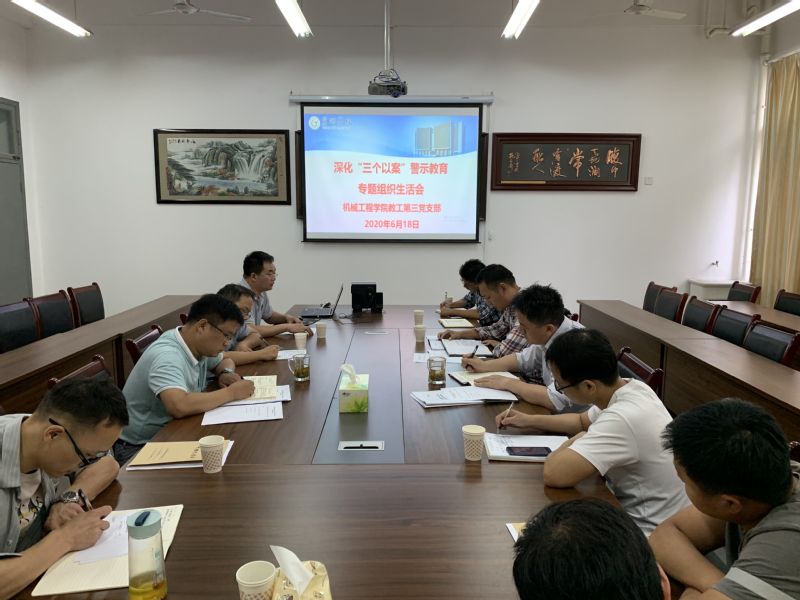 2020年6月18日下午,机械工程学院教工第三党支部在学院党员活动室召开深化“三个以案”警示教育专题组织生活会,学院副书记、副院长汪世义到会指导,支部全体党员参加了会议。会议由支部书记王玉勤主持。