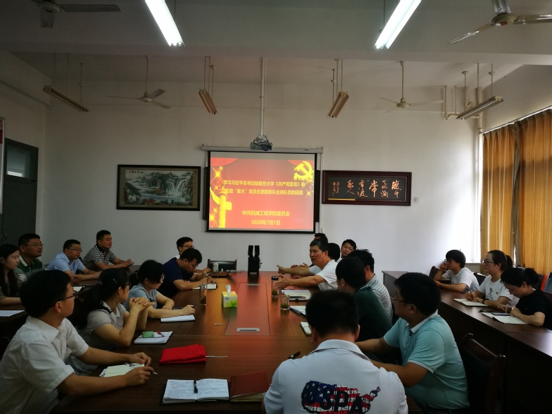 为庆祝中国共产党成立99周年,深入学习贯彻习近平总书记关于加强党史、新中国史学习教育的重要论述,以“牢记党的历史、坚守初心使命、决胜全面小康”为主题,2020年7月1日上午,机械工程学院党委在致知楼二楼党员活动室开展“七一”主题党日活动。活动由学院党委书记何照泽主持,全体党员参加了本次活动。