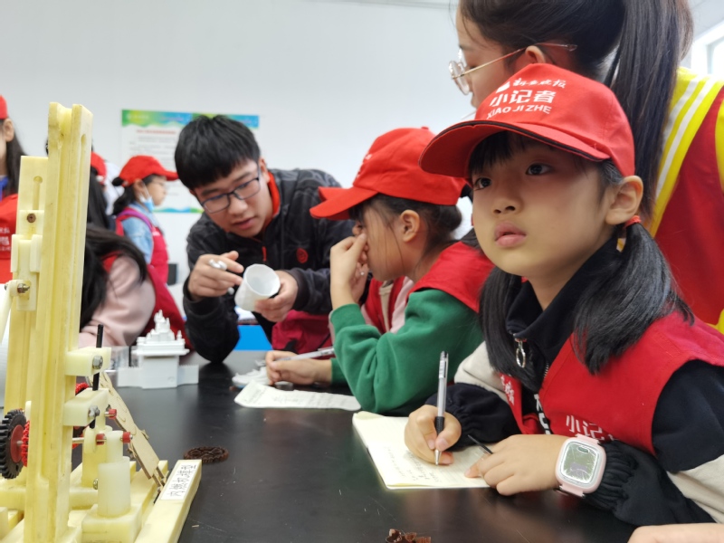 表演结束后,志愿者们带领小学生前往致知楼参观实验室。参观过程中,小学生们看着从未见过的新奇科技设施和创新机械装置,浓厚的兴趣油然而生,他们大大的眼睛中充满着求知欲,短短几分钟,在小学生们激烈的讨论声中,整个实验室热闹非凡。而后,科普志愿者展示模型并教授小学生们操作运行的方法,小学生们在亲身体验一番后,对各个模型还存在着许多疑问,他们渴望疑问能够得到解答。在科普志愿者进行疑问讲解时,小学生们认真听讲,时不时拿出笔记本进行记录。科普志愿者讲解完后他们迫不及待地再次进行实践,一番体验后,他们的脸上露出满意而又灿烂的笑容。