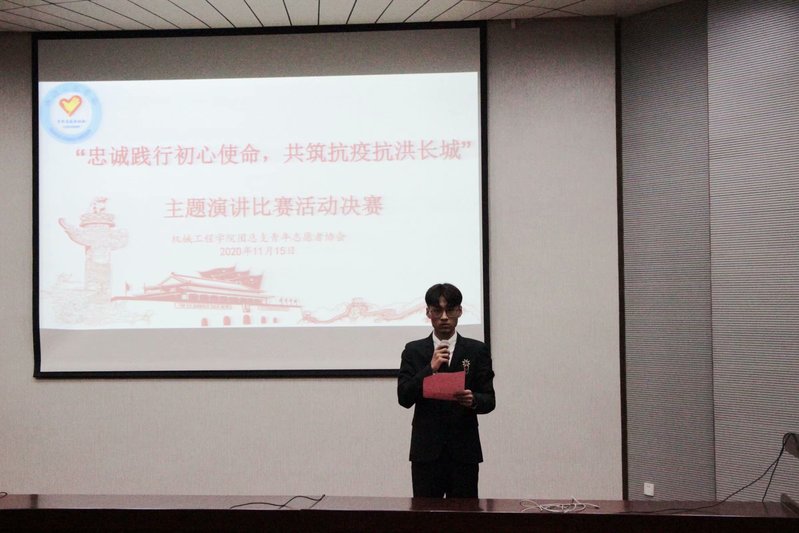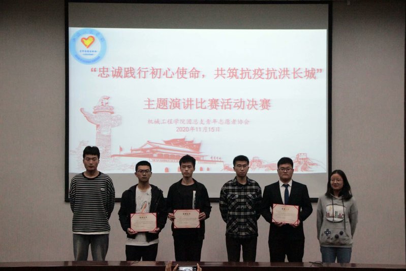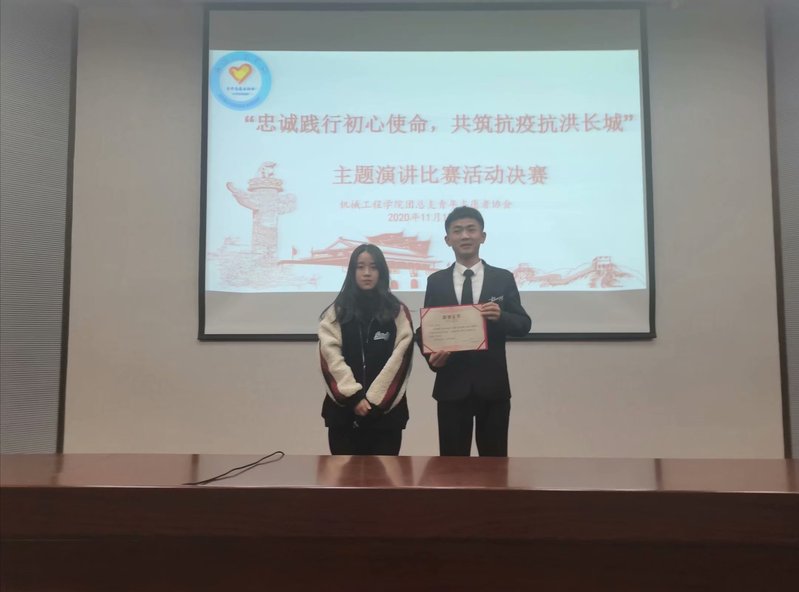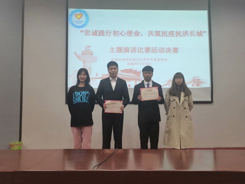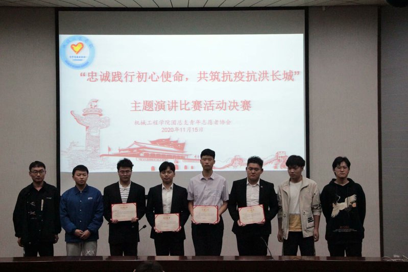 为弘扬抗洪抗疫精神,践行青春使命,机械工程学院团总支青年志愿者协会于2020年11月15日在致知楼报告厅举办以“忠诚践行初心使命,共筑抗疫抗洪长城”为主题的演讲比赛决赛,特邀校青年志愿者联合会副主席徐盼盼、认证部部长赵瑀、工商管理学院团总支青年志愿者协会会长吴凡、外国语学院团总支青年志愿者协会会长葛莉雯、副会长张语言、旅游管理学院团总支青年志愿者协会副会长詹华兴、飞鸿演讲与朗诵协会副会长滕双惠、机械工程学院团总支副书记方涛、学生会轮值主席徐闽海、学生会办公室负责人曾炜、青年志愿者协会副会长刘泽辉担任评委。此次比赛由机械青协干事司家祁主持,机械2020级各班学生到场观摩学习。