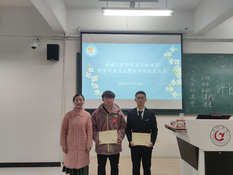 为进一步提高课堂效率,营造良好学习风气,推进“三全育人”工作深入开展,助力学生成长成才,机械工程学院团总支青年志愿者协会于11月29日在慎思楼301教室举办“无手机课堂”暨学风建设主题活动评比交流会,本次比赛特邀学院团总支副书记方钱、上一届机械青协副会长傅德曹及学院学生会轮值主席刘阳阳担任本次比赛评委,学院2019级和2020级各班学生到场观摩学习。