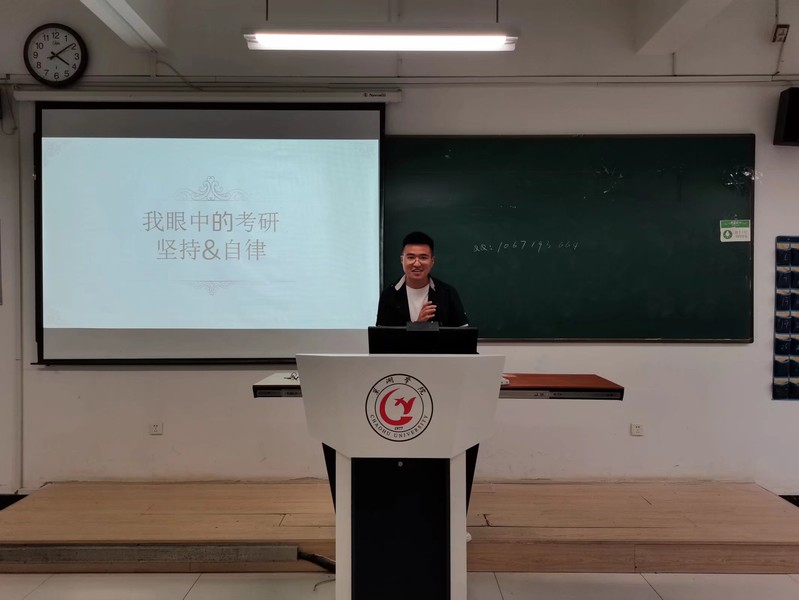 会上,何照泽致辞,他首先首先对刚刚经历考研洗礼的2017级同学们表达了诚挚的问候和良好的祝愿,祝福他们百尺竿头更进一步,前程似锦,鹏程万里。他深入分析了读研对大学生个人发展的重要性,研究生学习不仅可以全方位提高个人能力,还能给同学们提供更高的发展平台,更多的发展机遇,在激烈的就业环境中更有竞争力;最重要的是,考研是一个很艰难的过程,这个过程不仅能磨炼毅志力,还能增强自信心。接着,他简要介绍今年学院就业和考研情况,以及本学期教学巡查和值班时去教室、寝室巡查的情况。他表示此次经验交流分享会是通过经验交流、学习共享、相互促进来达到实现梦想的目的。大家正值青春,需要努力奋斗、历尽磨难,让自己的生命开出幸福之花。在上下求索的过程中,大家会迷茫、会疑惑,所以需要一座指引大家正确前行的灯塔,需要一个帮助答疑解惑的锦囊。今天有幸请到了2021届优秀毕业生为大家指点迷津,希望他们的分享让更多的同学了解考研,明确考研的目的,增强考研信心,为同学们亮一盏明灯。同时也希望大家珍惜此次机会,有所收获有所提高。