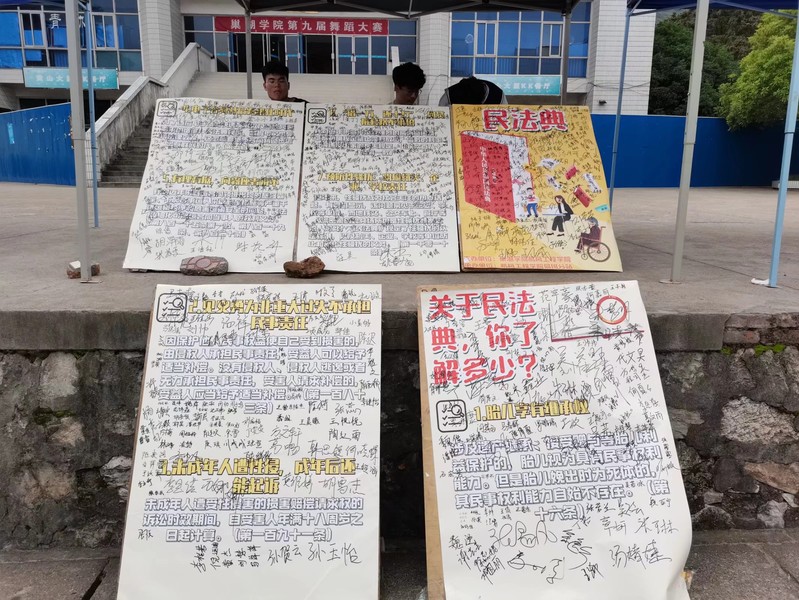 此次活动针对《民法典》重点列出了七项法律法规。一是胎儿享有继承权;二是见义勇为非重大过失不承担民事责任。此项法规避免了以往“救人未果反被追责”的尴尬局面,也帮助想见义勇为的人坚定信念;三是未成年人遭性侵,成年后还能起诉;四是电子合同开启无纸化时代;五是有理有据,向霸座者说不。“勿以善小而不为,勿以恶小而为之”,惩治“霸座”,有法可循;六是“借一万、还十万”,网贷套路不用怕;七是预防性骚扰,明确机关、企业、学校责任。同学们根据这七项法律法规,制作展板,在大礼堂前展示,让全校学生在自己关注并了解的法律法规的那个展板上签名,以此来统计全校大部分学生对《民法典》的关心和熟知程度。