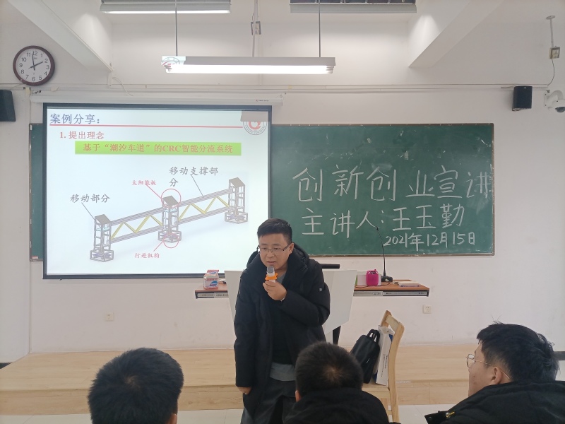 为进一步激发大学生创新思维,增强创新意识,宣传创业理念,丰富创业知识,引领学生做新时代中国特色社会主义的合格建设者和可靠接班人,机械工程学院于2021年12月15日下午在慎思楼北101和慎思楼北102教室举办创新创业宣讲,此次宣讲由王玉勤老师、邢刚老师、20机自1班韩志博、19机电1班李欣瑶主讲,2021级全体同学参加。