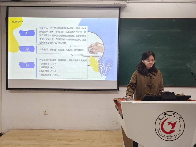 韩志博和李欣瑶分享了各自参加创新创业比赛的经验和收获,向大家补充说明参赛的注意事项。韩志博用生动形象的方式介绍赛事流程和奖项设置。他还鼓励同学们按照创新创业赛程时间节点提前谋划,按时参赛,以赛促学,不负青春。李欣瑶向同学们介绍了金年汇官方入口大学生创业孵化基地的基本情况和入驻要求,帮助同学们能更好地了解基地的情况。