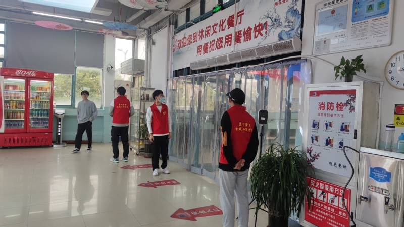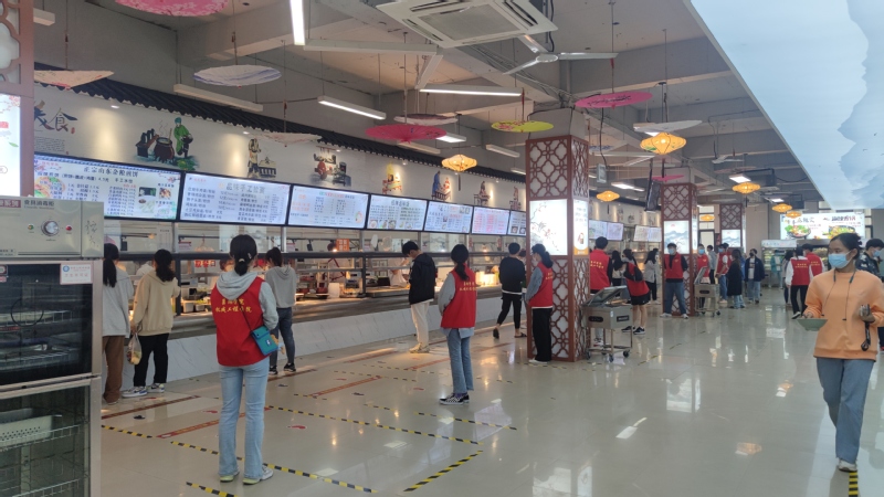 志愿者按照工作安排准时到达工作地点,身着红马甲在自己对应的“阵地”前坚守岗位,维护食堂就餐秩序,提醒同学们佩戴好口罩,在排队点餐时保持一定距离,就餐时错开就坐,积极配合学校防疫工作,保护好自己,有事找志愿者或辅导员,同心协力,共同抗“疫”。最后,志愿者们自发帮助食堂后勤人员打扫卫生,确保食堂用餐环境的干净卫生,助力学校疫情防控。