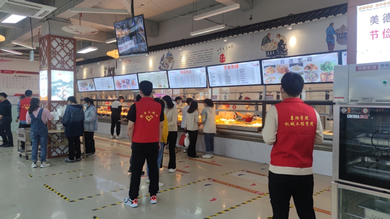 为配合学校疫情防控工作,增强同学防疫意识,保护同学就餐安全,机械工程学院团总支青年志愿者协会于2022年3月16日中午、晚上在二食堂二楼开展“疫情防控,志愿者与您同在”志愿活动。此次活动由机械工程学院团总支书记苏洁红组织,机械工程学院40名志愿者用切实的志愿服务行动谱写了助力疫情防控的青春之歌。