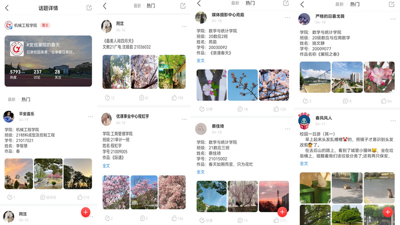 活动中,同学们通过手机、相机等捕捉光与影的瞬间,记录校园的春天,定格生活的点滴,用美丽的心灵、细腻的镜头、独特的视角,感悟生命之美,共享多彩生活。此次大赛运用今日校园平台话题圈线上投票和线下评审相结合的形式,共计260余名学生在“发现巢院的春天”话题圈发布动态,累计访问人次超5800次,累计点赞量超5000次。参赛作品主要围绕春天、希望、梦想、幸福等主题,包含人物、动植物、校园风景等内容,充分展现了同学们热爱生活、热爱校园、热爱生命的精神风貌。