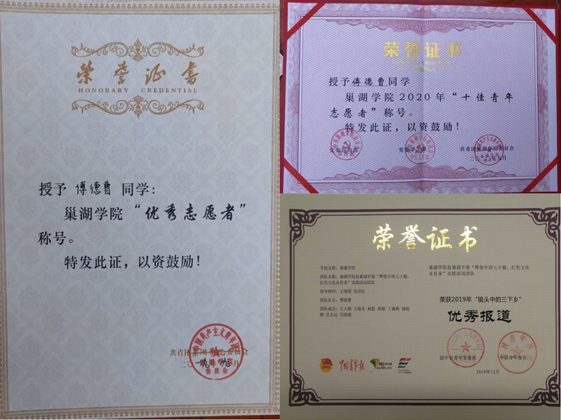 步入大学,一次偶然的机会,傅德曹收到青协的宣传单,看到学长学姐做的志愿者,下决心也要像他们一样帮助更多的人。提交报名表,经过两轮面试成功加入青协大家庭,并成为青协宣传部一员,从此开启了志愿之旅。