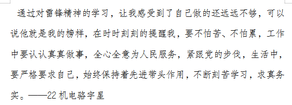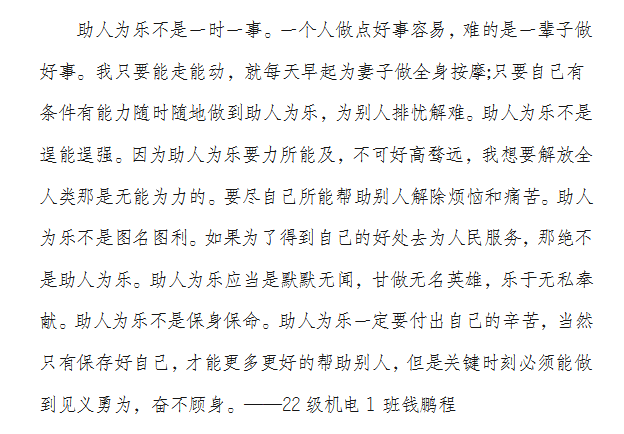 22机电1班杜文明表示,雷锋精神已经融入到中华民族的血液和灵魂,青年同学更应该继承和弘扬,让世界变得更加美好。青年志愿者协会何蕾同学说弘扬雷锋精神在新时代更具有现实意义,带领青年志愿者去参加留守儿童支教活动就是最好的体现。(文/方婧 图/何蕾 季前程 初审/李融 终审/何照泽)