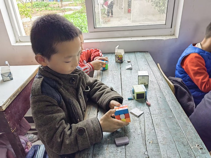 还有统计建模协会为留守儿童们准备的魔方课。小朋友拿到魔方,但就是无法还原。支教者们逐一为小朋友们亲手示范操作,耐心讲解,还原之后,一阵惊叹。