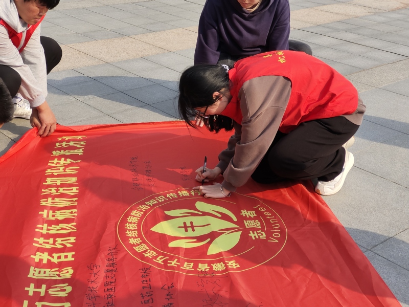 活动现场,志愿者们穿着统一红马甲,手持机械工程学院青年志愿者协会与防结核活动主题的旗帜,在湛蓝的天空下摆出象征着“关爱肺健康,你我砥砺同行”的整齐阵型。整齐嘹亮地喊出“生命至上,全民行动 共享健康 终结结核”的口号,志愿者们在旗帜上签名。经过此次宣传,机械青协负责人何蕾表示,“宣传活动提高了我对防治结核病的知识,接下来自己也会共同努力,真正实现终结肺结核的目标。”