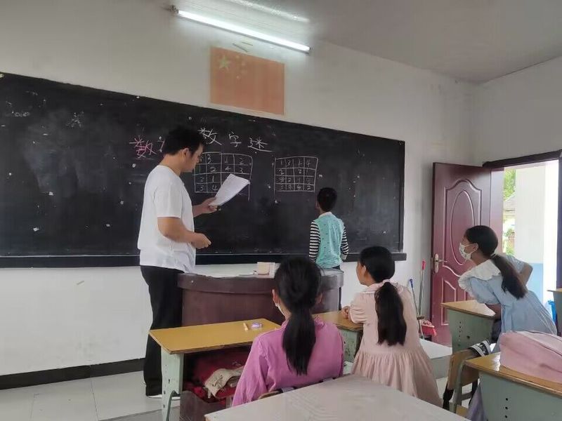 上课铃声响起,数学课开始了。一个个数字引起留守儿童的兴趣,令他们沉浸在数字的世界。基本教学任务完成,又开始了数独游戏题,留守儿童们在乐中学,在学中乐。语文课上的文化常识,四大名著,唐宋八大家,四大民间传说……孩子们积极回答,不会的题目,志愿者就告诉他们答案。