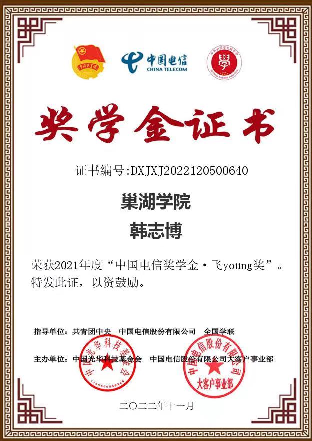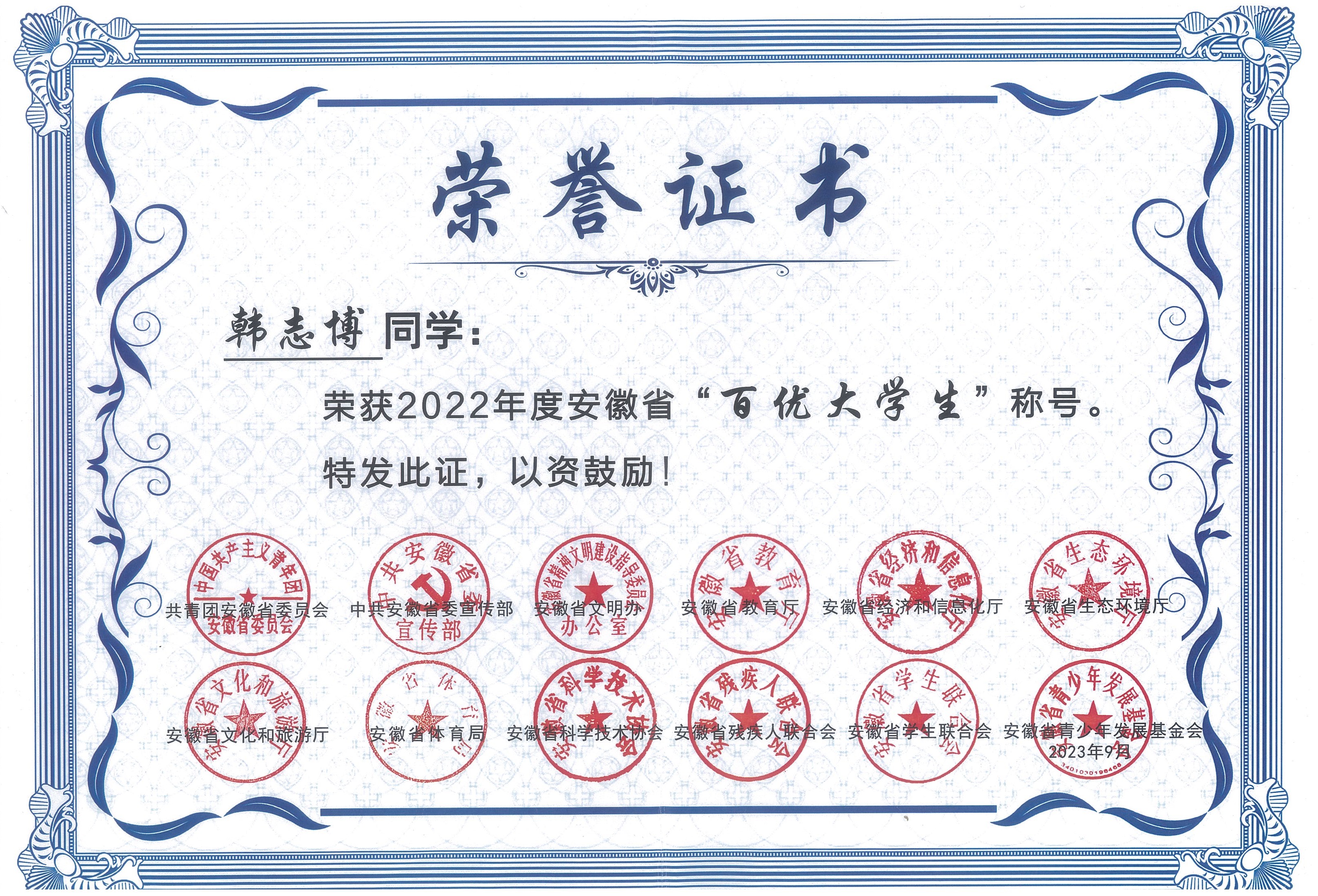 韩志博,男,2001年4月出生,汉族,中共党员,金年汇官方入口机械工程学院2020级机械设计制造及其自动化学生。在校期间任班级团支部书记,曾任机械创新协会社长。任职期间,所在班级团支部曾获学校“五四红旗团支部”“先进团支部”等荣誉称号。个人曾获2022年度“安徽省大学生年度人物”“安徽省百优大学生”等荣誉称号,2021年度本科生国家奖学金、2022年度中国电信奖学金飞Young奖、第九届挑战杯安徽省大学生课外学术科技作品竞赛二等奖等省级及以上奖项20余项。授权发明专利2项、实用新型专利1项,发表学术论文5篇。主持国家级大学生创新创业项目2项,作为项目成员参与国家级、省级大创项目各1项。2024年5月,考取华中农业大学硕士研究生。