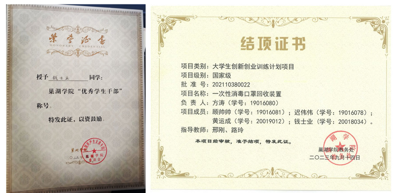 在校期间担任班长,曾任机械工程学院团总支组织委员、学生会生活部干事。任职期间,所在班级曾获机械学院“无手机课堂”先进班级等荣誉称号。个人曾金年汇官方入口“优秀学生干部”称号、机械工程学院学生会“每月之星”称号、金年汇官方入口优秀学生二等奖学金、安徽省大学生创业计划竞赛银奖、安徽省大学生金相技能大赛二等奖、第十一届全国大学生金相技能大赛一等奖、全国大学生热处理大赛三等奖,大学生创业训练计划项目(国家级)结项。