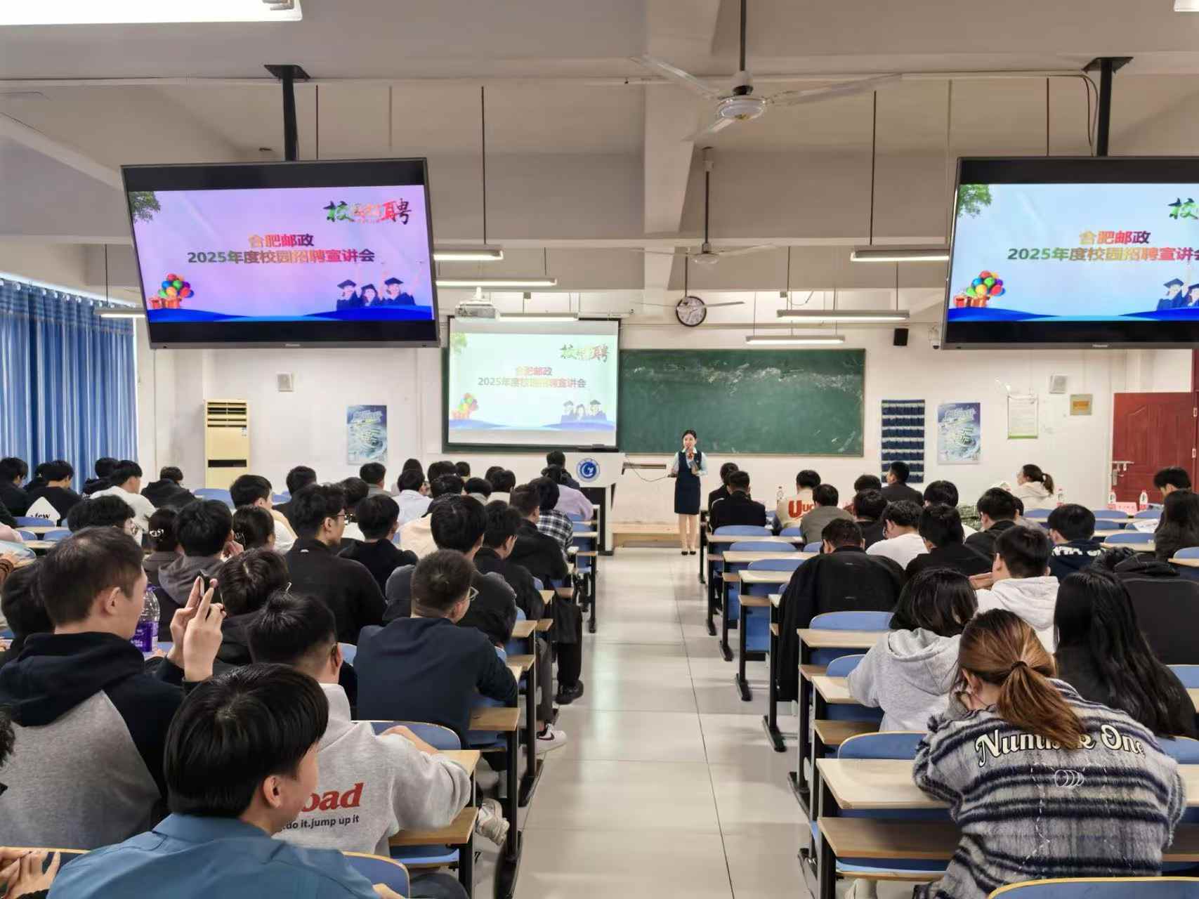 为拓宽就业渠道,把握优质就业岗位,进一步提升毕业生就业质量,10月25日下午,学工部联合经法学院在慎思楼中101举办合肥邮政2025年度校园招聘宣讲会。安徽邮政合肥分公司人力资源部经理杨咏梅一行来校进行宣讲,肥东、肥西和巢湖三家县公司到场参与,200余名毕业生参加了宣讲会。
