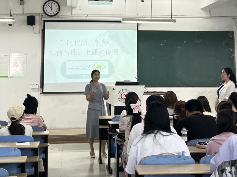 为提升学生幼儿教师职业口语的实践运用能力,加强与实践基地的交流,切实提高协同育人水平,2023年6月9日下午,教师教育学院学前教育专业师生在慎思楼北201开展了”园长进课程进课堂”活动,巢湖中心幼儿园园长於婷婷走进专业课堂,为2022级学前教育专业近百名学生,带来一场题为“新时代幼儿教师如何备课、上课和说课”的讲座,活动由《幼儿教师口语》课程教师袁凤琴主持。