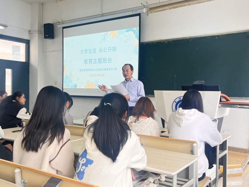 为深化“三全育人”综合改革,推深做实领导干部联系班级工作,进一步提高思想政治工作的针对性、有效性,10月25日下午,校党委委员、宣传(统战)部部长张连福深入教师教育学院2023级音乐表演专业一班召开“大学生活 从心开始”主题班会。