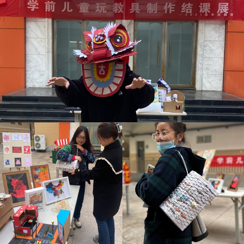11月15日至17日,教师教育学院在艺术楼展厅举办21级学前教育专业《学前儿童玩教具制作》课程作品展活动。本次展览作品共有90余件,包括折纸、剪纸、纸雕塑、区角模型以及各领域玩教具等多种类型,所用材料涉及彩纸、轻黏土、橡皮泥、废旧材料和自然材料等,作品丰富多元,变废为宝,吸引了众多教师和学生。