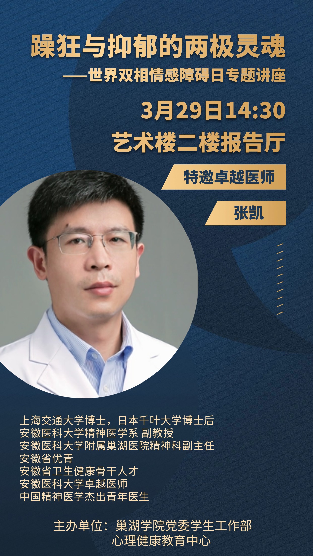 为了普及心理卫生知识,提升学生心理健康素养,正确认识双相情感障碍,3月29日下午,我校心理健康教育中心特邀上海交通大学医学院博士、日本千叶大学博士后、安徽医科大学附属巢湖医院精神科副主任张凯,开展“躁狂与抑郁的两极灵魂”世界双相情感障碍日专题讲座,本次讲座由教师教育学院副院长、心理健康教育中心副主任郑艳主持,百余名师生参加其中。