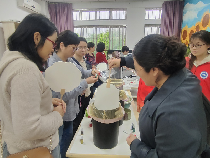 在积极心理体验室,王安琪为参观人员准备了传统非遗手工漆扇,大家发挥自己创造力进行调色、染色,制作出一把把绚丽多彩、独一无二的漆扇作品,使他们在操作中感受中华优秀传统文化的魅力,体验心流状态带来的成就感和愉悦感,促进身心健康发展。