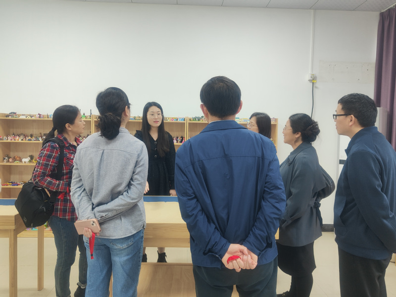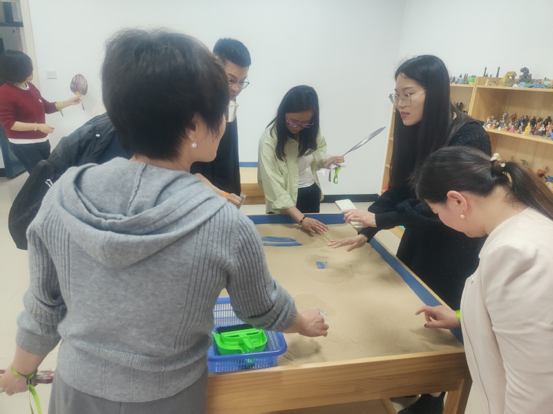 为了让老师们感受心理健康教育工作的氛围,现场安排了沉浸式体验环节。在心理专业学生志愿者的指引下,老师们参观了心理中心的沙盘游戏室、积极心理体验室、团体活动室、宣泄治疗室、心理测量室等。