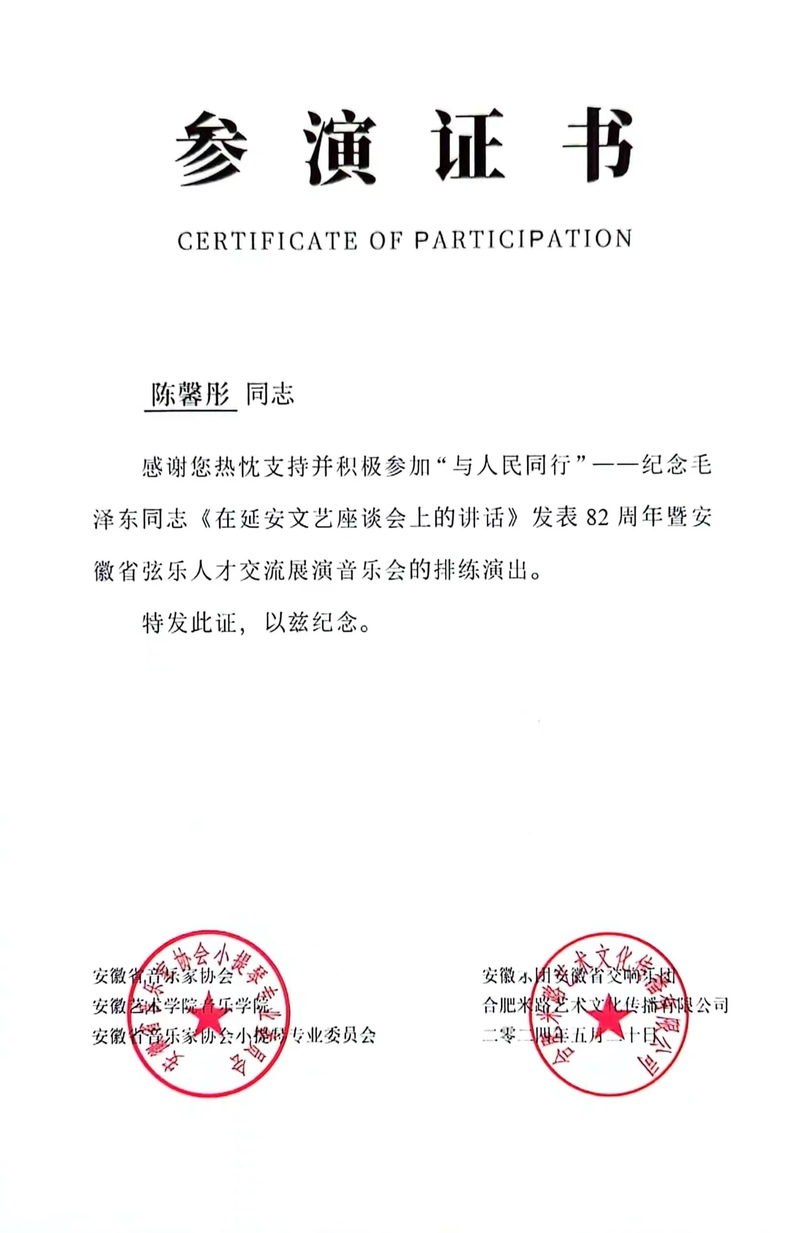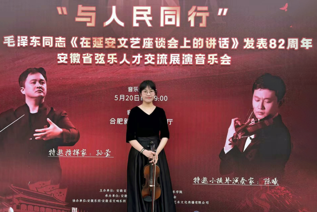 5月20日至21日,由安徽省音乐家协会、安徽艺术学院音乐学院主办,安徽省音乐家协会小提琴专业委员会承办的“与人民同行”——纪念毛泽东同志《在延安文艺座谈会上的讲话》发表82周年安徽省弦乐人才交流展演音乐会分别在新华公学和安徽艺术学院精彩上演。金年汇官方入口教师教育学院2022级音乐表演专业陈馨彤同学有幸参演,与大师同台表演。