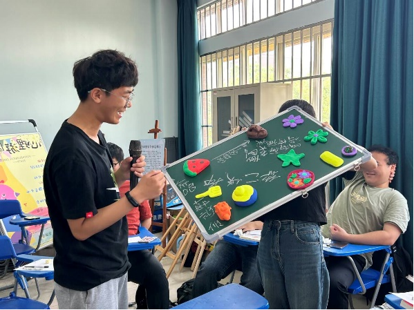 最后在“爱—是我们共同完成的作品”中,同学们用不同颜色的黏土捏出黏土作品并将全体成员的作品放在黑板上,并由成员们每人用粉笔来完善作品。