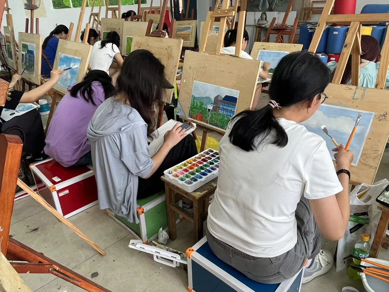 任课教师曾鹏选取一张校园景色全貌,分割多份布置任务,要求每位同学描绘校园全貌的一角,最后集体拼接,呈现出艺术与自然相融合的美丽校园。此项任务让每位学生都参与其中,在绘画中既培养学生对画面的整体观察与局部描绘的能力,也展现出学前教育学子们青春勃发的精神风貌和浓浓的爱校之情。