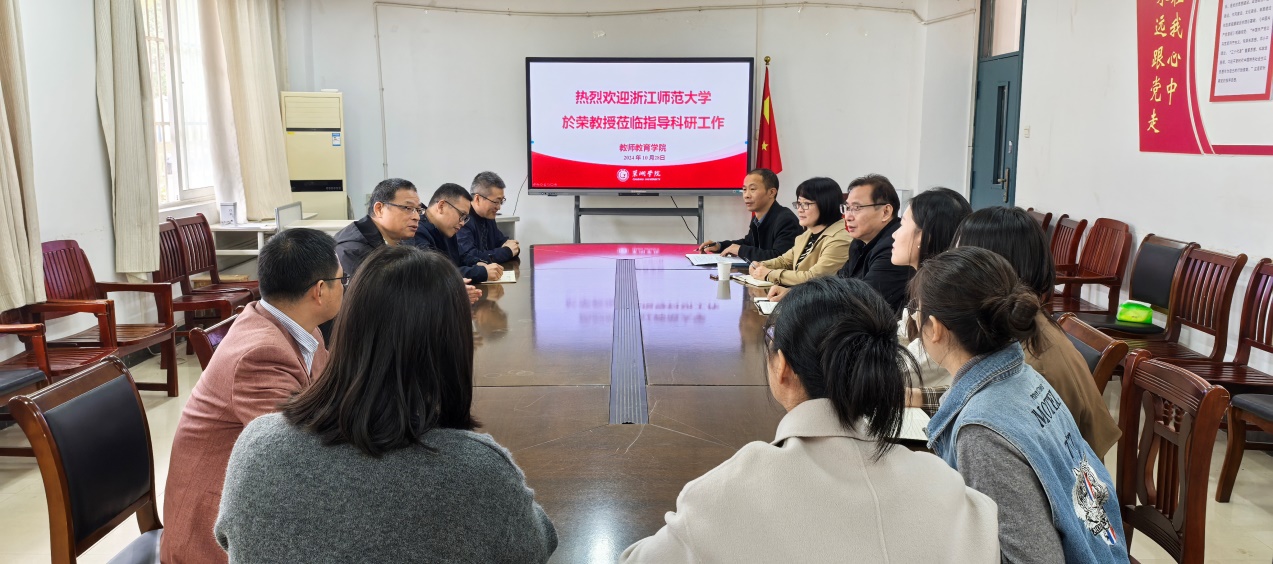 为提升学院教师科研水平,加强学科专业建设,教师教育学院于10月28-29日分别召开科研项目申报、学科专业建设研讨会。会议邀请了浙江师范大学教师教育学院博士生导师於荣教授莅临指导。学院党委书记朱玉票主持会议,学院领导班子成员、系部负责人、部分专业教师参加会议。