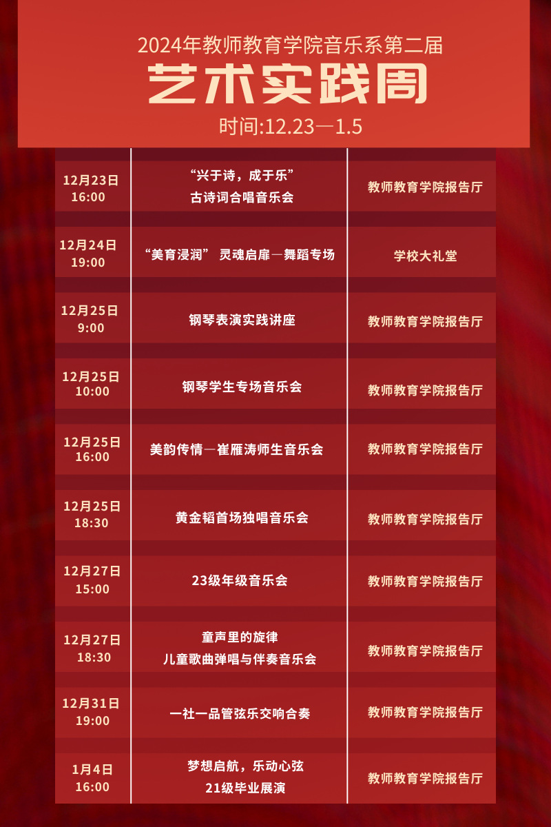 教师教育学院音乐系第二届艺术实践系列活动,于2024年12月23至2025年1月5日举办,为期两周,涉及声乐、器乐、合唱、表演,包括独奏、独唱、合唱、合奏等多场音乐会。全体音乐教师及200余名学生参与本次系列活动。(文/殷梦晗 图/李可 初审/郑艳 终审/蔡广)