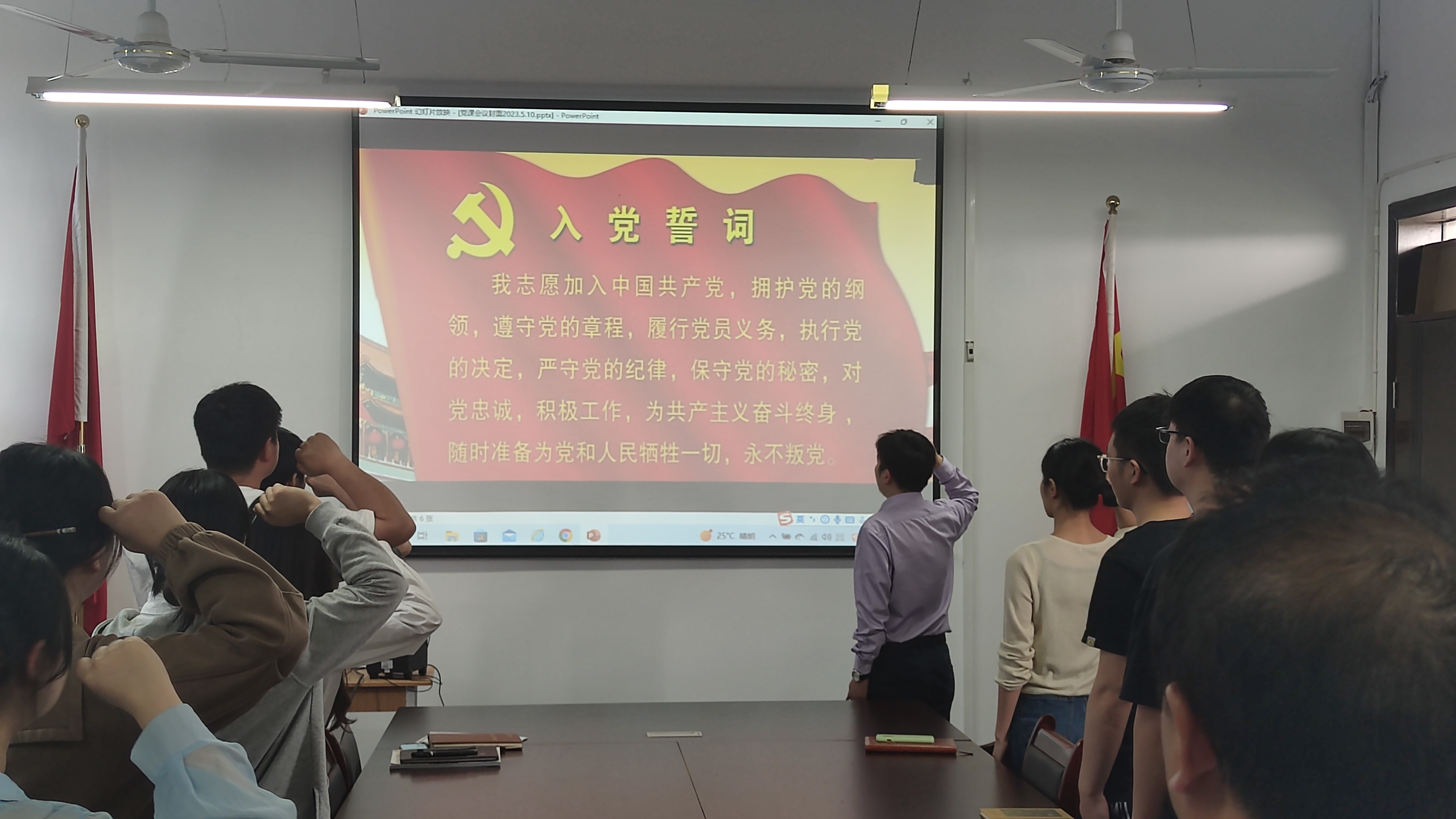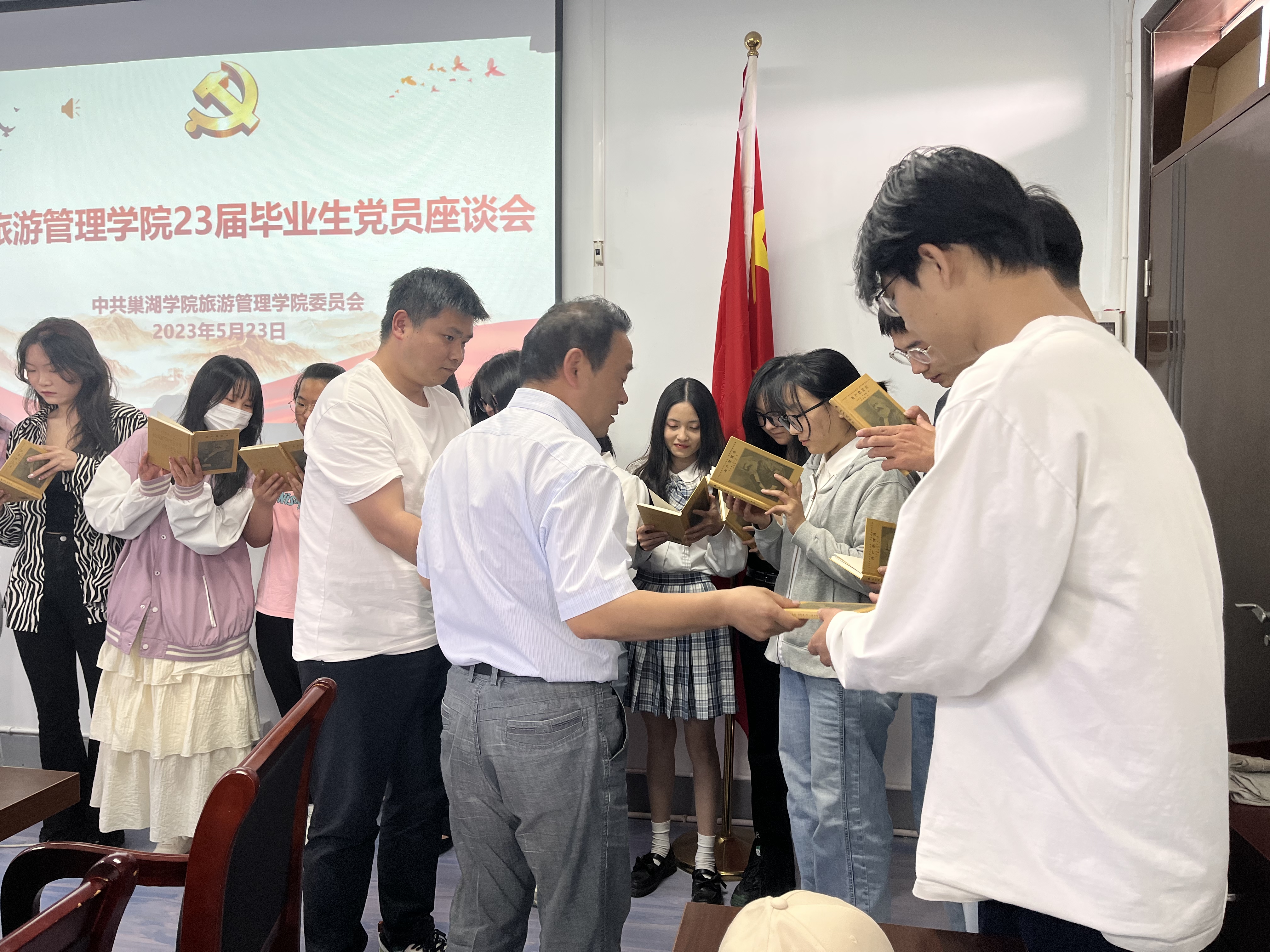 最后,学院党委给毕业生党员代表赠送《中国共产党宣言》书籍并带领全体党员重温了入党誓词。