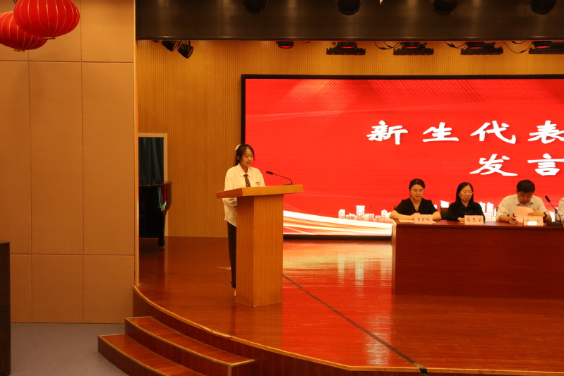 2023级生物工程专业邓娟作为新生代表上台发言。她表达了对大学的憧憬和期待,期待自己和同学们能在端正心态中潜心笃学,在兴趣领航中善作乐学,在自强不息中勇攀高峰,将个人奋斗与国家发展同频共振,保持热爱奔赴属于自己的山海。