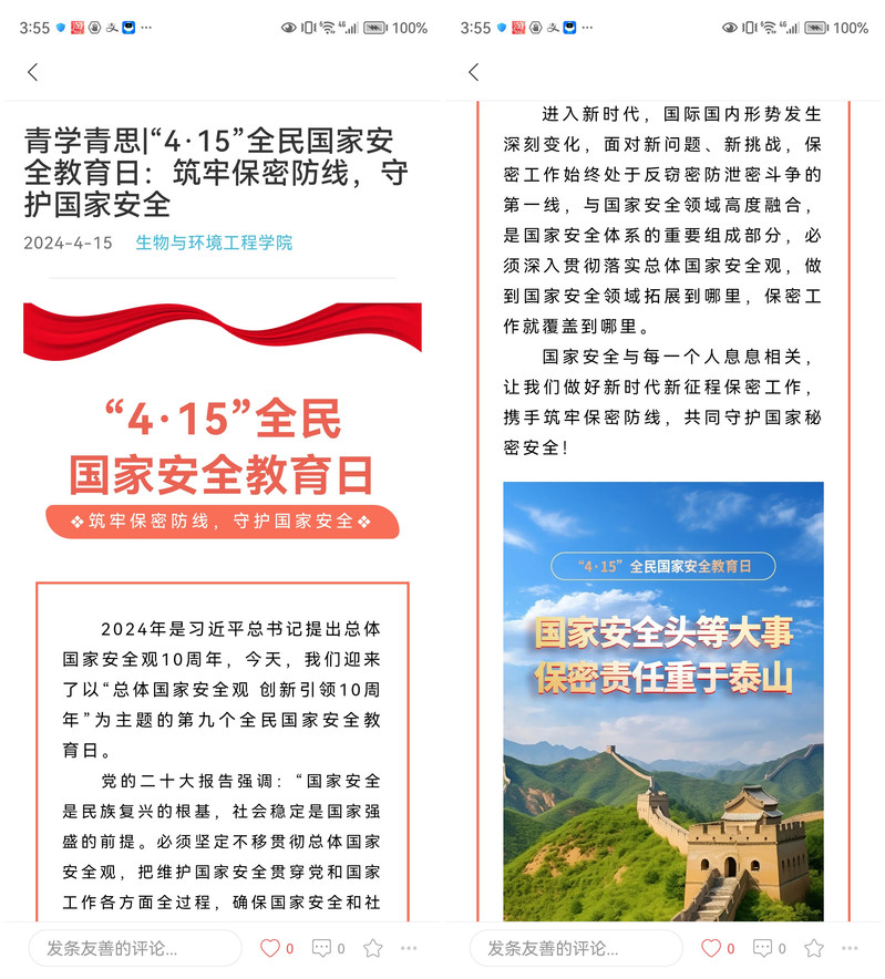 学院始终把国家安全教育纳入学生的日常学习生活中,积极拓展师生线上线下学习了解国家安全知识的渠道,以国家安全和保密宣传、反邪教警示教育为主题,发布相关推文。同时,通过举办升旗仪式等活动,面向师生开展国家安全知识宣传,营造良好的校园国家安全氛围。