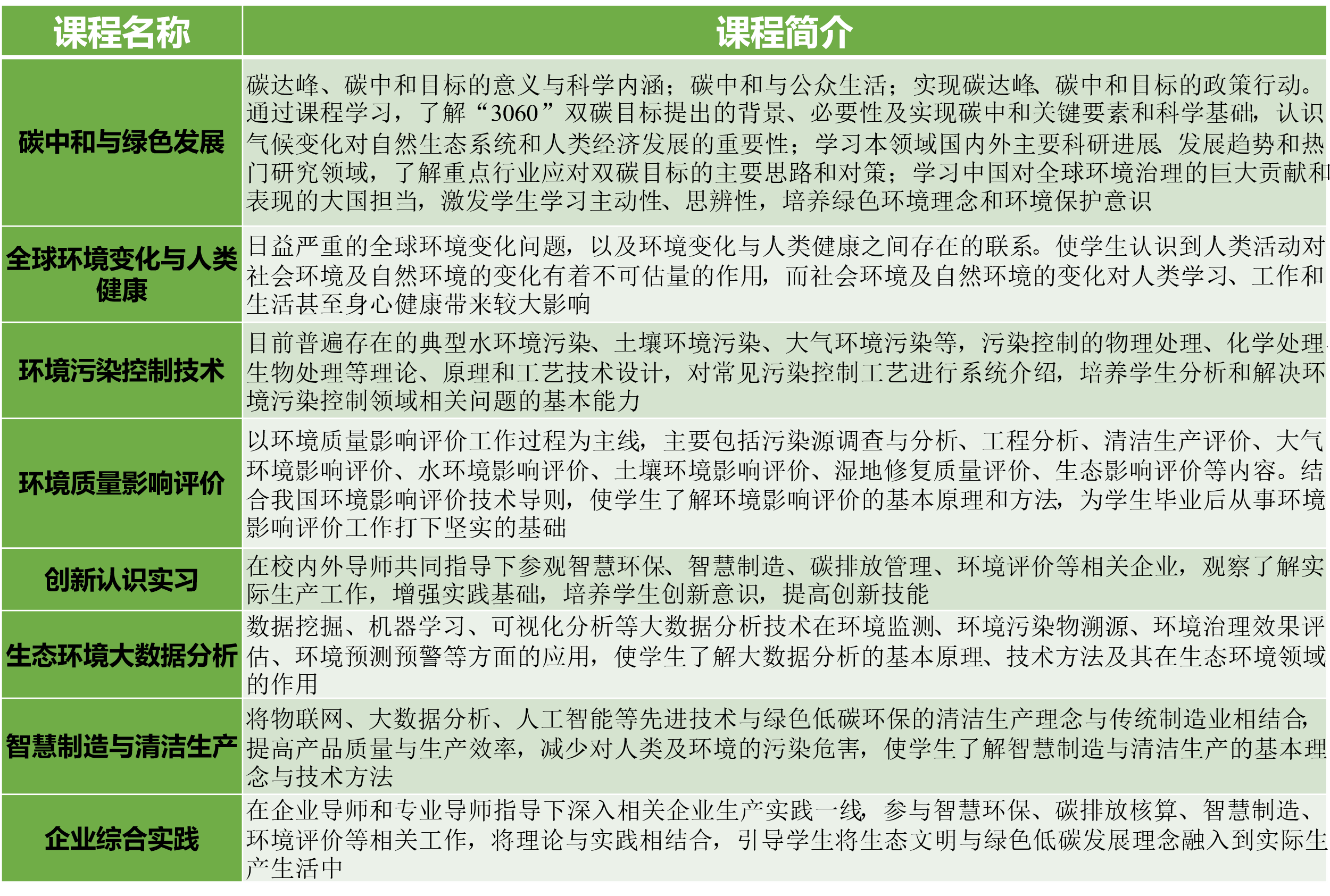 “智慧环保与碳中和”微专业是由生物与环境工程学院开设,旨在服务美丽中国建设以及“2030年碳达峰,2060年碳中和”目标,面向安徽省新兴战略产业对具有“双碳”理念的技术、管理人员的需求,培养专业学科与绿色发展理念深度融合的应用型人才,拓宽实习就业渠道,增强学生就业竞争力。