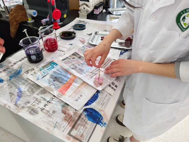寻找树叶脉络,留住斑斓色彩。叶脉书签制作比赛于润德楼302实验室开展。同学们浸煮叶片、去除叶肉、漂白、染色、风干、塑封,叶脉书签制作现场气氛热烈,经过一道道工序之后,一片片富有创意的精美叶脉书签就制作完成了。比赛结束后,专业评委们根据同学们的完成情况、元素选择、色彩配比等标准对作品进行了评选,最终鲍雪萍同学凭借完整的叶脉结构和多重色彩搭配荣获一等奖。