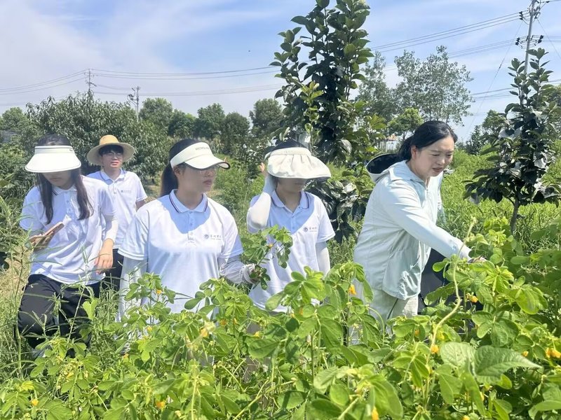 7月23日上午,实践团赴黄麓镇中草药种植基地,实地了解中草药生长情况。黄凤美向队员们介绍了芍药、板蓝根、白菊、红花、急性子、花椒的生长特性和中草药从播种到长成的全过程。她随后从种植基地拔出一株板蓝根植株,向大家展示药用部位,帮助队员们更加直观的认知中草药。下午,实践团来到烔炀镇中草药加工基地参观,进一步了解不同阶段中草药的生长状态以及不同加工工艺下中草药的不同药效。
