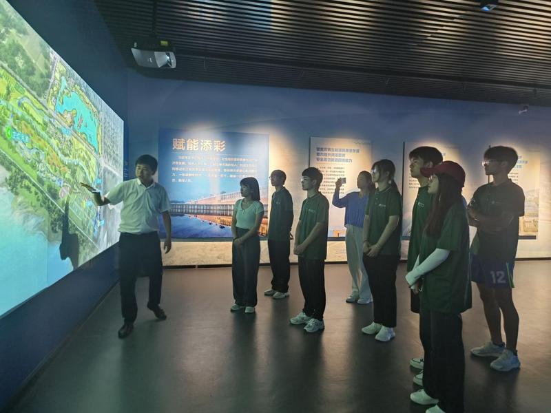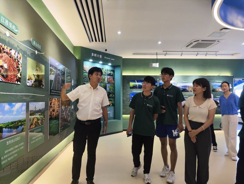 7月23日,“河小青”实践团师生来到六安市金安区城北镇,参观淠河右岸生态农业示范区,城北镇人大主席李小文、副镇长周璇、规划建设所所长张传兵接待了实践团一行。张传兵向大家介绍了示范区的主体功能和水管家智慧调控系统、凤凰桥新概念水质净化厂、“污泥变花海”等创新举措,带领师生们参观了生态科普中心的“丰饶之域”“珍宝乐园”“环保之翼”“和谐之美”等展厅。此次参观学习,为“河小青”志愿服务开展提供了新的思路。
